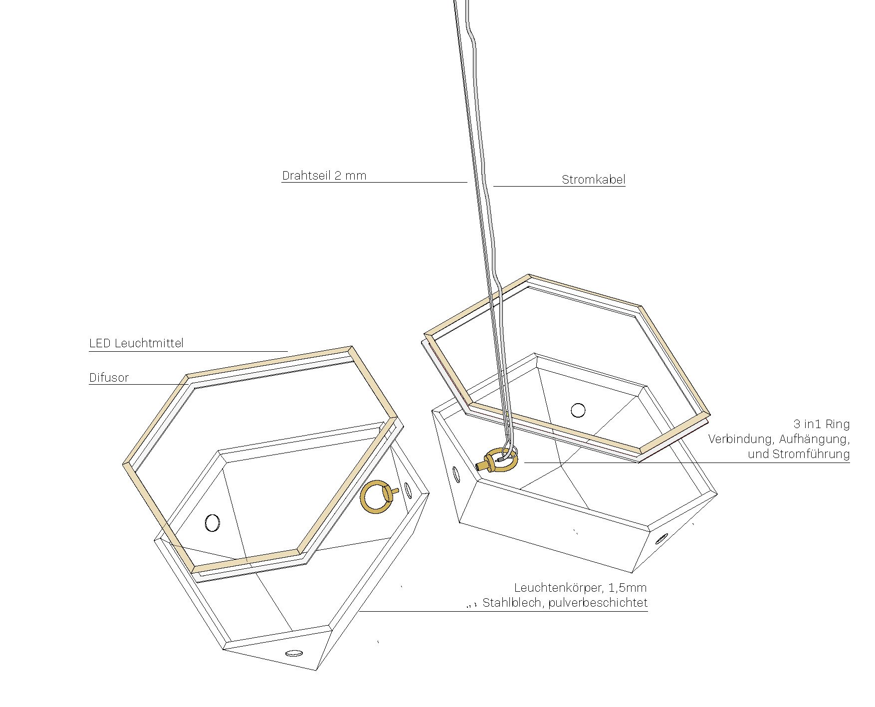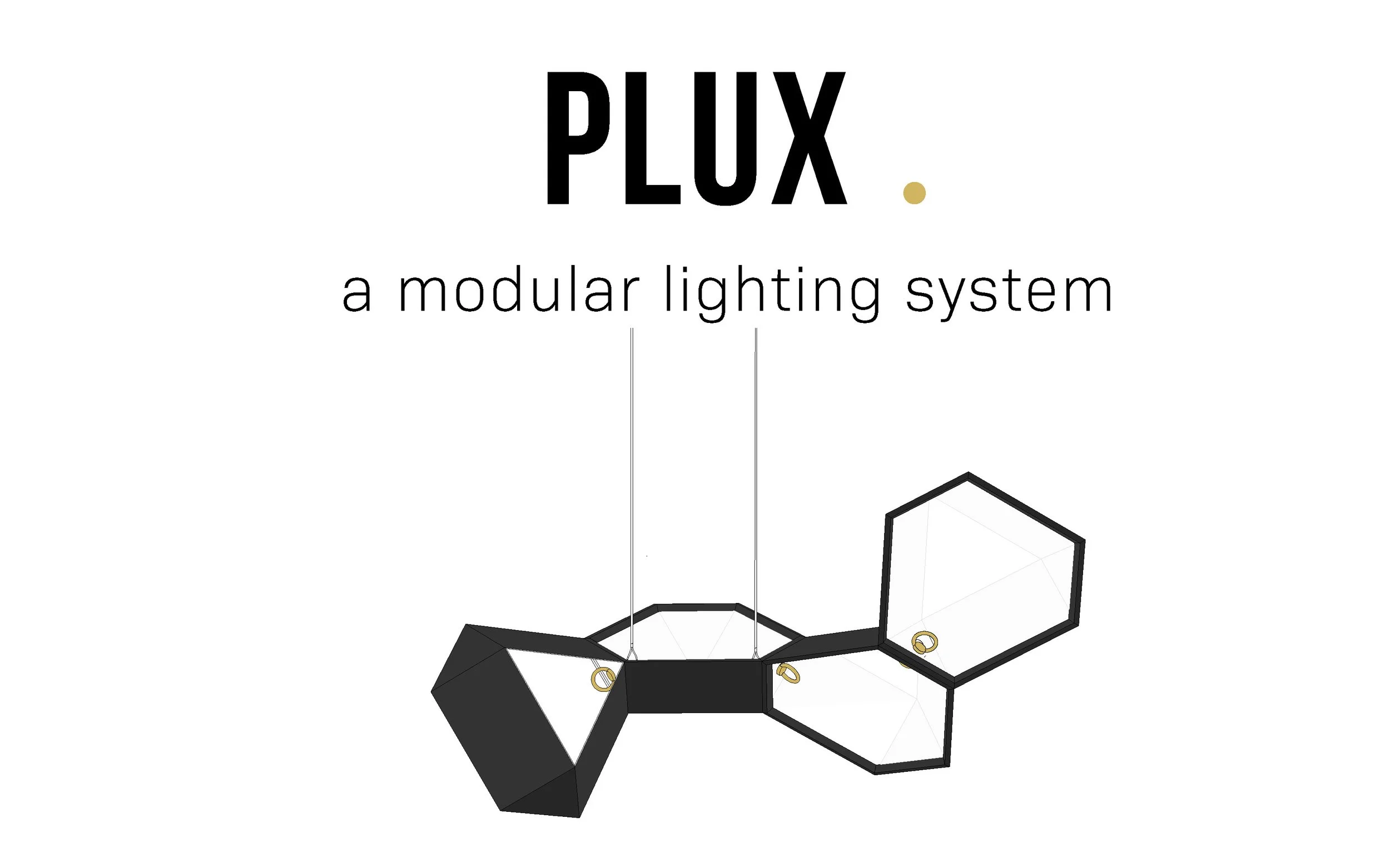 Plux, ein modulares Leuchtensystem ist ein frei kombinierbares System aus Leuchtkörpern. Es gibt genau ein Modul, welches aufgrund seiner geometrischen Form , nahtlos im Raum ausbreitbar ist. Das Modulgehäuse hat durch seine klare Formensprache einen starken industriellen Charakter. Es besteht aus nur einem Körper mit gefalzten Kanten. Die Anschlussflächen der einzelnen Module sind als gleichseitige Dreiecke ausgebildet. Hierdurch wird eine Positionierung der Module in drei Richtungen ermöglicht. Die Verbindung der Module, die Stromführung und die Aufhängung erfolgt über eine speziell entwickelte Öse, den 3 in1 Ring. Als energieeffizientes und platzsparendes Leuchtmittel werden LED Stripes verwendet und verdeckt in die gefalzte Gehäusekante eingesetzt. Bedeckt werden die LED Stripes durch einen Difusor. Hierdurch erfolgt eine flächige Beleuchtung des gesamten Körpers. Der Grundkörper und der 3 in 1 Ring sind aus Stahlblech und Stahl gefertigt und anschließend farbig gepulvert. Die Innenflächen des Leuchtenkörpers sind stets in weiß gehalten. Die Verwendungsmöglichkeiten von Plux sind äußerst vielseitig – von einer Tischhängeleuchte über einen Raumtrenner bis hin zu einer kompletten Deckenverkleidung.